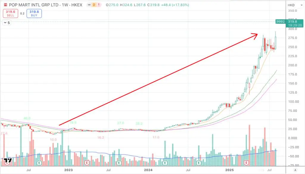圖片說明:泡泡瑪特股票走勢圖顯示從 2022 年低點大幅上漲至 2025 年 8 月中旬高點的驚人漲幅